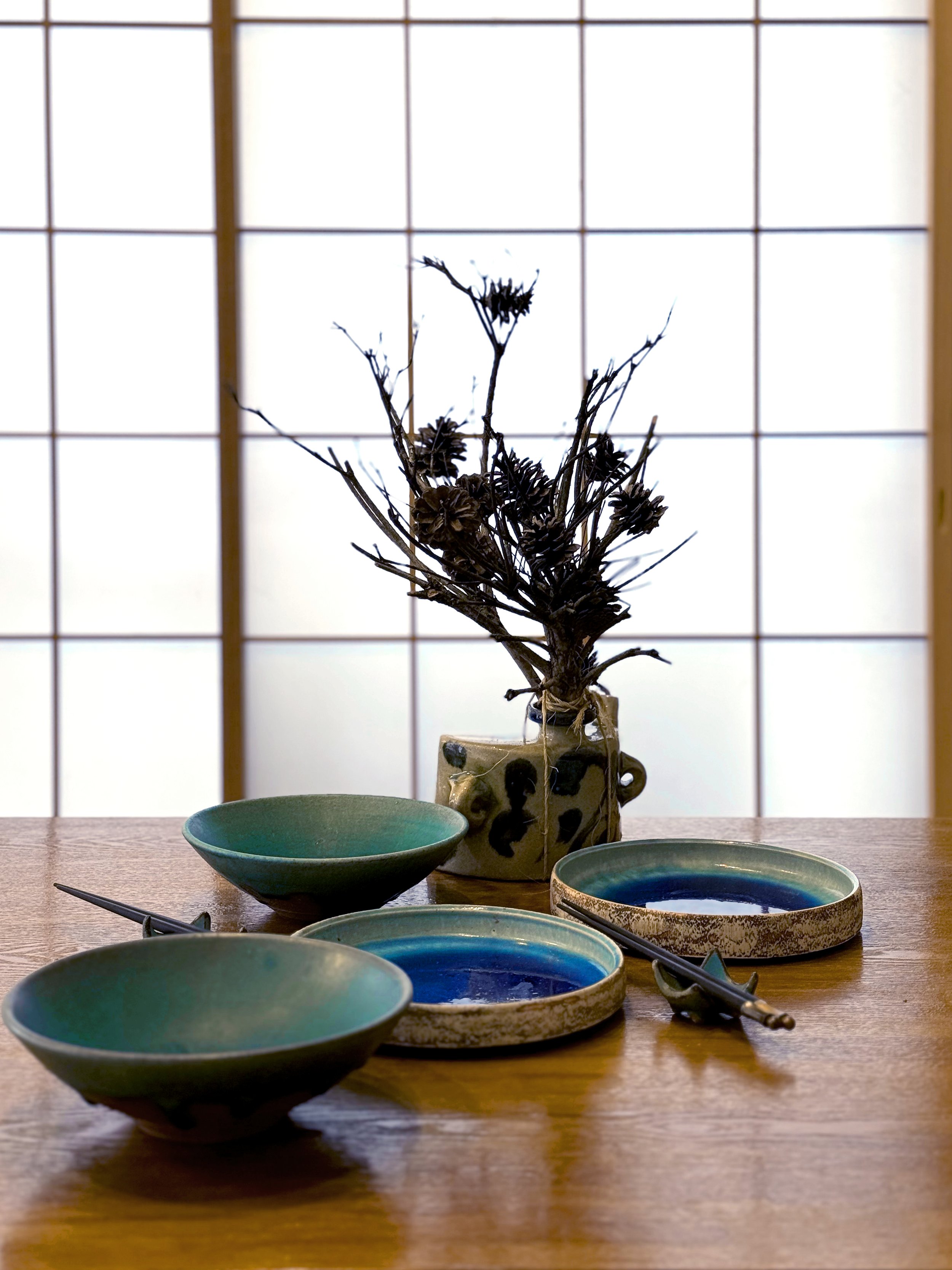 An intimate dinner featuring beautiful blue Okinawan ceramics by Ryuhaku, combining flavors from the east and west.
