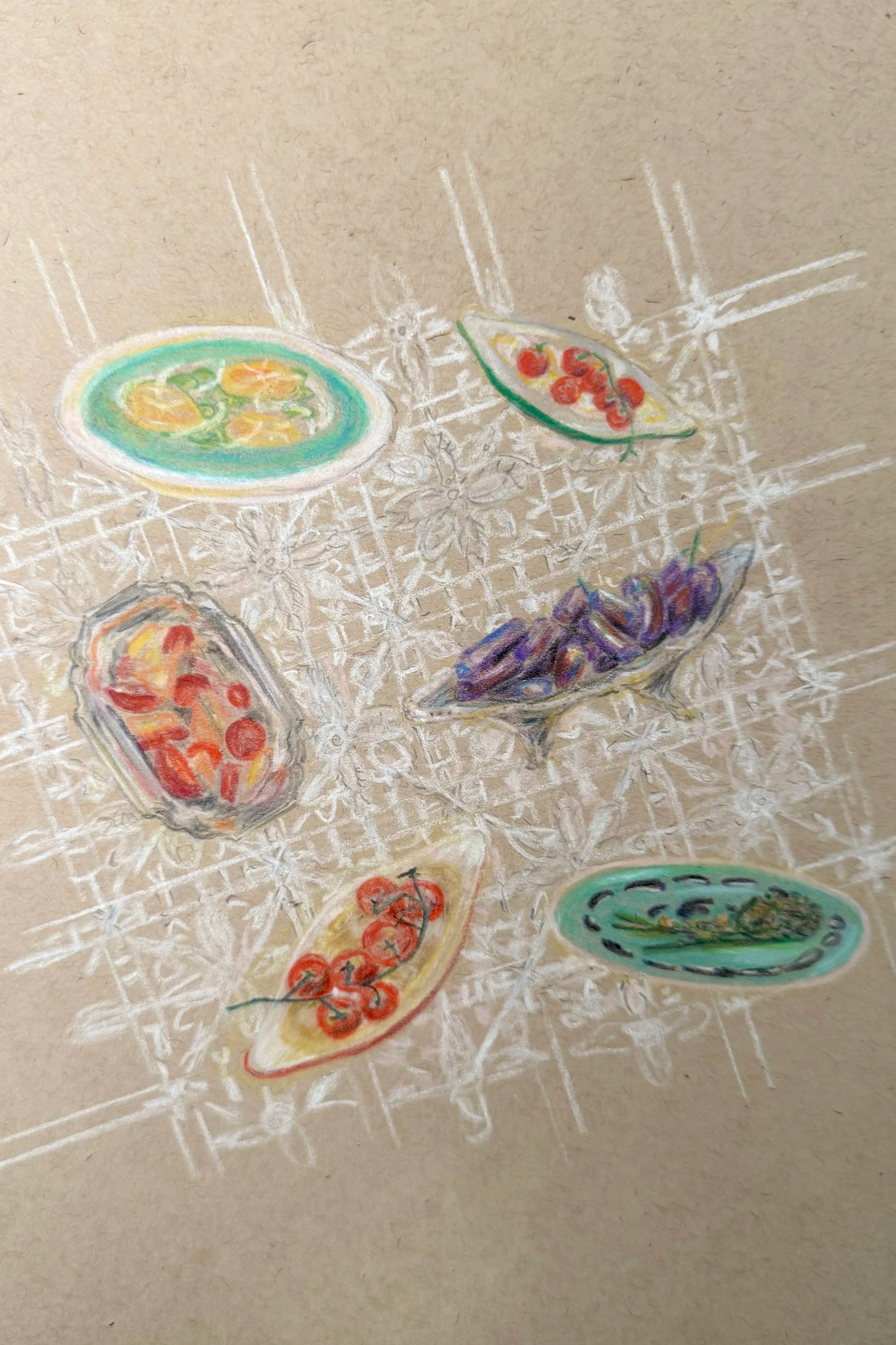 A series of drawings depicting the moments and plates shared on dining tables.